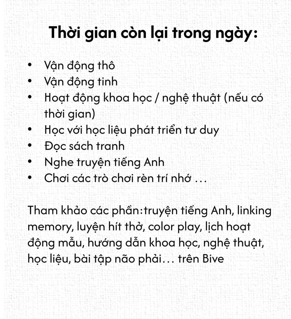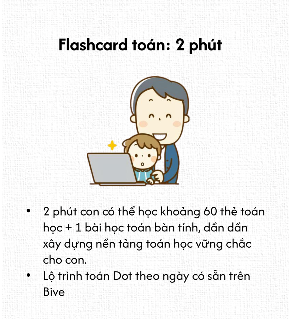 Nếu mẹ có nhiều thời gian hơn thì có thể dành thêm 5-10 phút mỗi ngày để cùng bé khai thác kho học liệu phát triển tư duy, bài tập não phải, học liệu EQ… trên Bive. Những gì bé nhận sẽ vô cùng giá trị.
