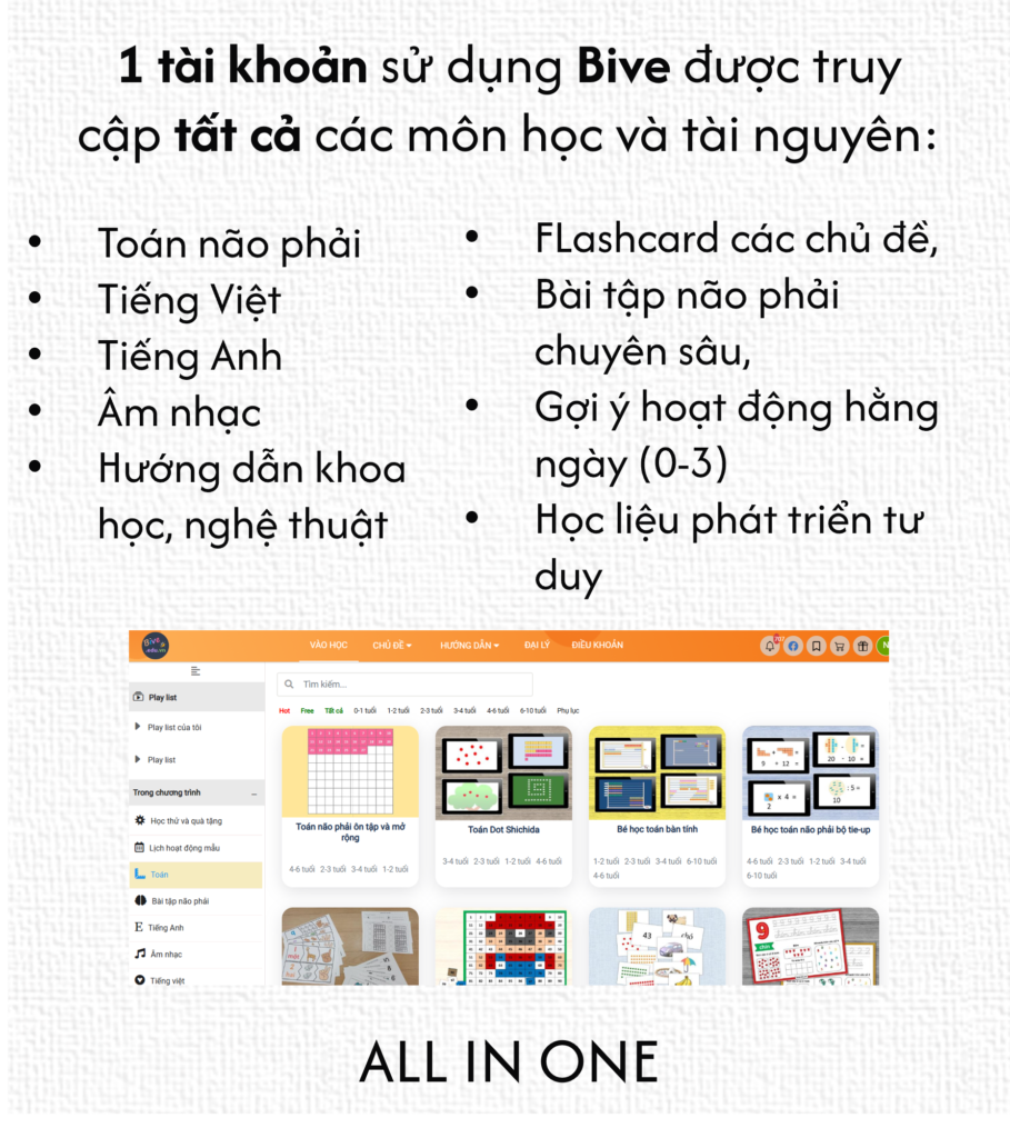 Như những gì mẹ có thể thấy trong các bộ toán não phải tại Bive, hệ thống học liệu được thiết kế đa dạng và có chiều sâu. Khi trẻ được “tắm mình” trong môi trường toán học từ sớm theo cách nhẹ nhàng như vậy, khả năng toán học không chỉ cải thiện, mà còn lớn lên một cách tự nhiên, bền vững và đầy hứng thú.