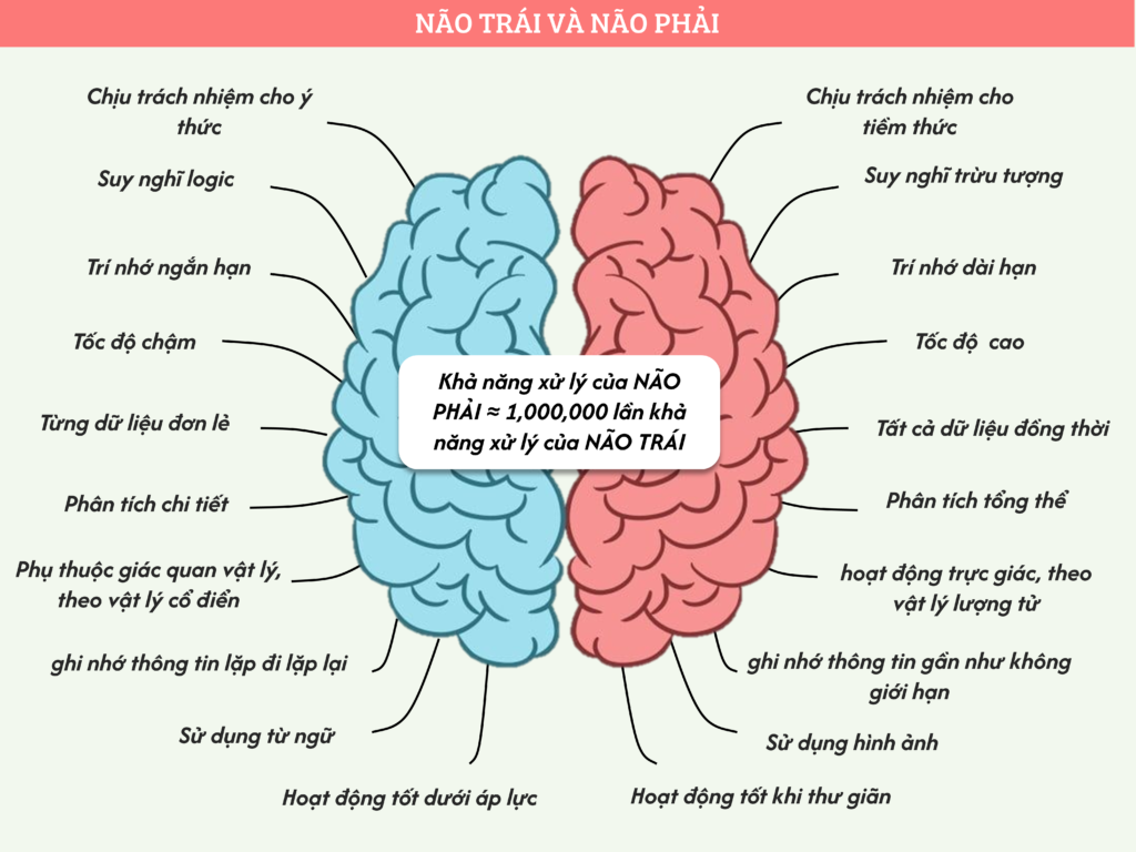 Đặc biệt, cần lưu ý rằng khả năng ghi nhớ của não phải hoạt động mạnh mẽ nhất trong 6 năm đầu đời. Đây chính là “cửa sổ vàng” để kích hoạt và nuôi dưỡng năng lực này cho trẻ. Nếu được rèn luyện đúng cách trong giai đoạn này, kênh xử lý và truyền dẫn hình ảnh sẽ được duy trì lâu dài. Có thể hình dung rằng, sự kết nối giữa não phải và não trái trong những năm đầu đời giống như một chiếc van đang dần khép lại theo thời gian. Vai trò của giáo dục não phải chính là giữ cho chiếc van đó mở lâu hơn, để dòng chảy hình ảnh và trực giác của trẻ không bị gián đoạn, mà tiếp tục phát huy giá trị trong suốt quá trình trưởng thành.