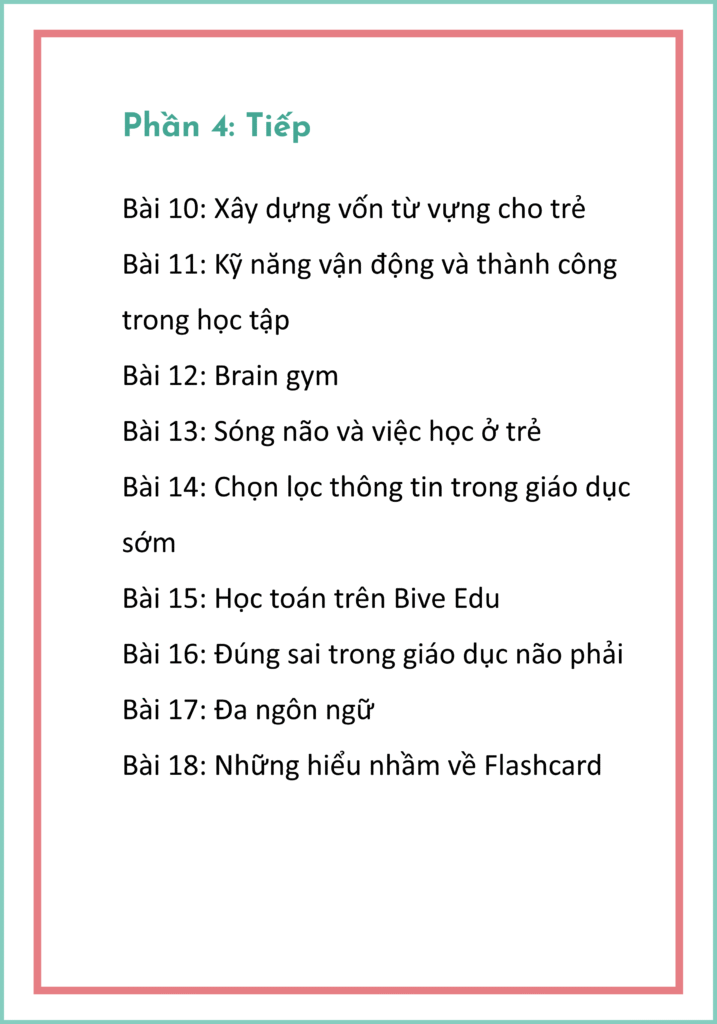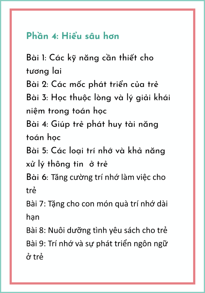 Trong phần này, bạn sẽ được tiếp cận các kiến thức nền tảng về cách bộ não trẻ tiếp nhận thông tin, ghi nhớ và chuyển hóa thành năng lực thật sự.